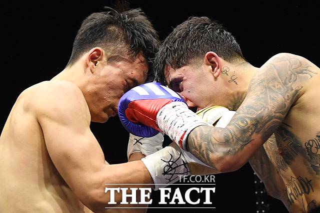 [더팩트ㅣ고양=남용희 기자] '2022 스페셜 복싱 매치'가 11일 오후 경기 고양시 킨텍스 1전시장에서 열린 가운데 양승호(왼쪽)와 션 가르시아가 경기를 펼치고 있다.