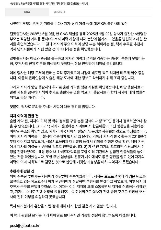 출판사 측은 "온라인 기록상 저자의 한국 활동이 2018년부터 이어지고 있었으며, 서울시교육청과 대검찰청 등에서 강의를 진행한 것을 확인하고 해당 기관에서 강사 이력을 검증했을 것으로 판단했다"고 밝혔습니다.