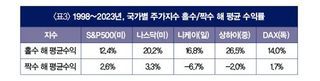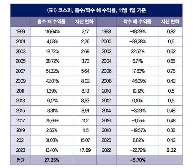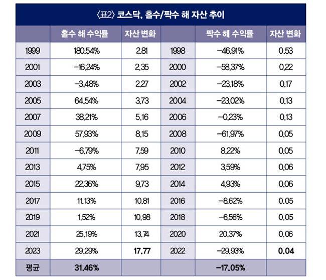 1998~2023년까지 총 26년간 홀수 해의 수익률이 짝수 해에 비해 높았다. 홀수 해 수익률은 평균 27.35%, 짝수 해는 평균 –5.70%로 역성장을 기록했다.코스닥은 이 차이가 더 극명하다. 같은 기간 코스피의 홀수 해 수익률은 평균 31.46%였고, 짝수 해는 –17.05%였다. 매해 홀수 해에만 투자했으면 자산은 17배 불어났을 수 있다. 반대로 짝수 해에 투자했으면 손실을 봤을 가능성이 크다.