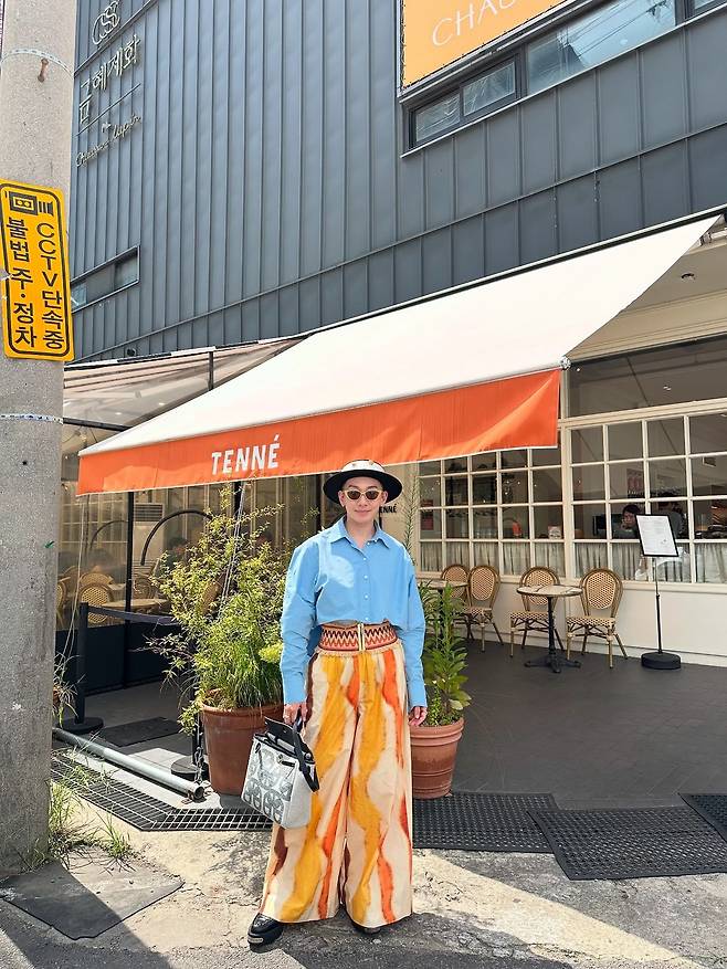 사진 속 스타일은 밝은 하늘색 셔츠와 강렬한 패턴의 와이드 팬츠를 매치해 이목을 집중시킨다. 셔츠는 기본적인 디자인이지만 오버핏 실루엣으로 착용자의 자유로운 무드를 강조하며, 팬츠는 오렌지·옐로·아이보리 컬러가 불규칙하게 번지는 듯한 패턴으로 예술적인 감각을 드러낸다. 허리 라인에 더해진 지그재그 패턴 벨트 디테일은 룩에 포인트를 주며 시선을 위아래로 분산시켜 균형감을 높인다. 전체적인 라인은 깔끔하게 떨어지면서도 바지의 과감한 실루엣 덕분에 다리가 길어 보이는 효과가 있다.