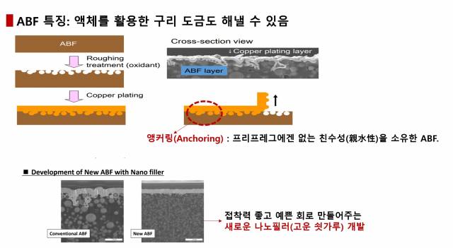 이건 아주 큰 차별 포인트입니다. FC-CSP 등 기존 기판에서 ABF와 같은 역할을 하는 '프리프레그(Prepreg)'는 소재 특성 상 무전해도금 공정에서 '앵커링'에 상당히 취약합니다.