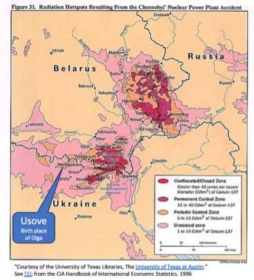| ▲ 체르노빌은 우크라이나와 벨라루스 접경 지역에 위치해 참사 당시 바람이 북향으로 불어 방사능 낙진이 대부분 이웃나라인 벨라루스에 떨어졌다. 오염 정도에 따라 완전폐쇄지역, 영구관리지역, 주기적관리지역, 무명오염지역의 4개 지역으로 구분했다. Usove는 올가가 태어난 고향으로 체르노빌 오염 지역이다. |