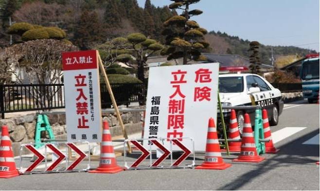| ▲ 후쿠시마 핵사고 지역의 반경 약 20km 위치의 출입금지 표시판과 경찰차. 2011년 4월 최예용 촬영 |