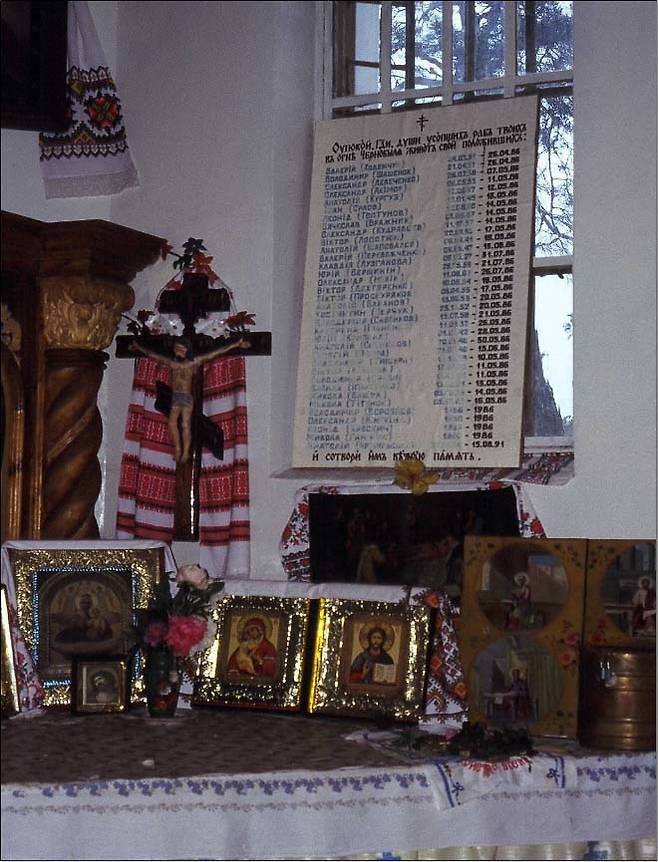 | ▲ 우크라이나 키에프에 있는 체르노빌 피난 이주민거주지역의 한 성당에 체르노빌 사고로 사망한 38명의 명단이 적혀있었다. 1994년 최예용 촬영 |