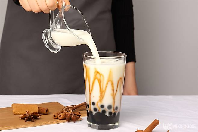 그다음 우유를 부어준다. 우유는 일반 우유 외에 두유나 무가당 아몬드 우유로 바꿔도 좋다. 층이 예쁘게 나뉘도록 조심히 붓고, 마지막으로 흑당 시럽을 다시 한번 위에 드리즐로 뿌려 마무리한다. 빨대로 저어 마시면 흑당, 커피, 우유, 펄이 조화를 이룬 시원한 흑당 버블티가 완성된다.