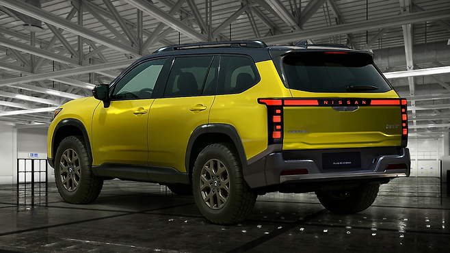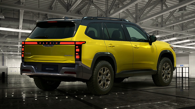 투톤 외관에 검은색 루프, 두꺼운 오프로드 타이어, 플라스틱 클래딩 등 공격적인 디자인 요소들도 인상적이다. 후면의 테일램프와 닛산 레터링은 현대적 감성을 더욱 강조한다.