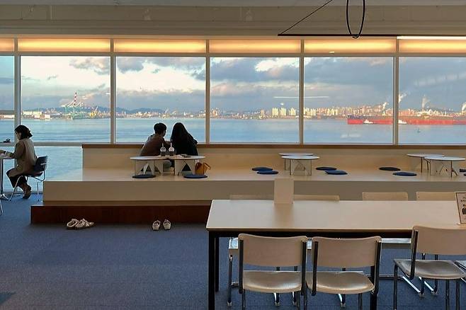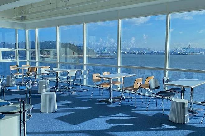 예쁜 카페 얼트는 입구부터 감성과 예술이 폭발하는데요. 세 면이 통유리라 앉아만 있어도 바다가 파노라마처럼 펼쳐지고, 파란빛 인테리어에 아크릴 조형물까지 더해져 분위기는 완전 물씬 납니다.