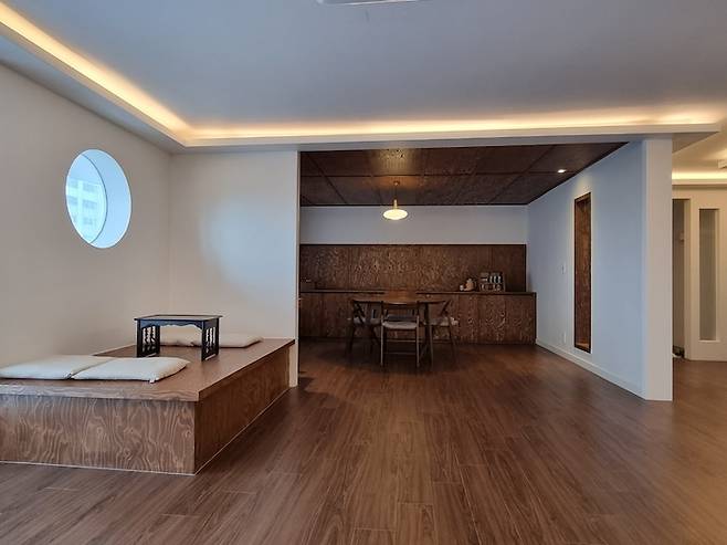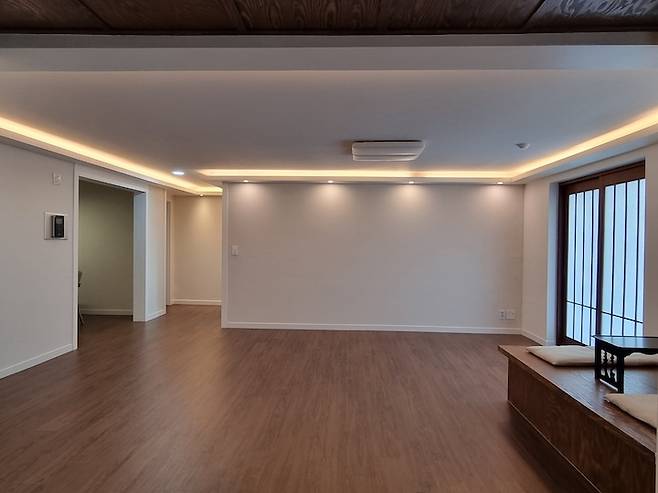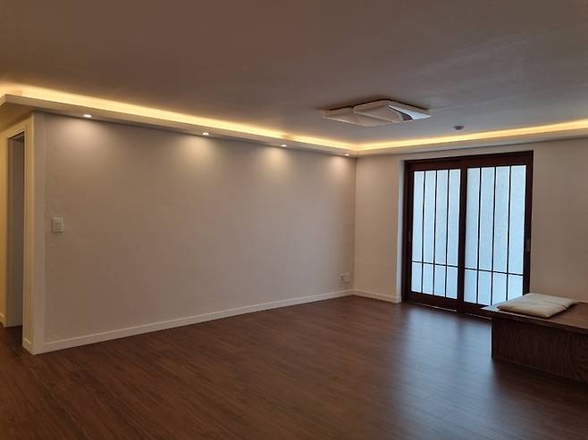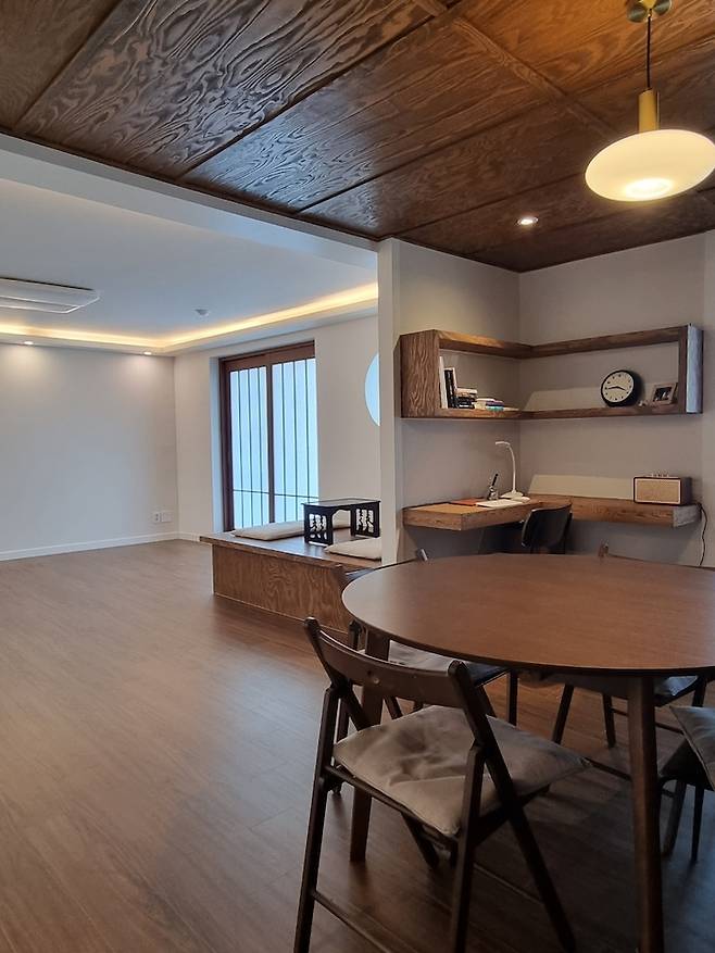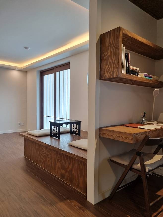 부부만 있기에 굳이 방 4개는 필요 없어서 넓은 거실로 사용하고자 가벽을 철거했습니다. 철거 시 가벽은 미리 평상 사이즈만큼 남겨 놓았고 앞 쪽 공간은 평상을~ 뒤쪽 공간은 책상을~ 붙박이로 제작했네요.