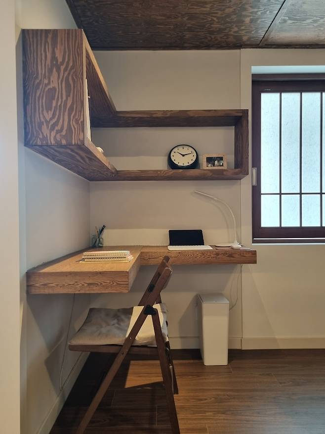 가벽을 사이에 두고 안쪽에는 붙박이 책상을 만들어 저만의 작은 서재 공간을 꾸며보았습니다.