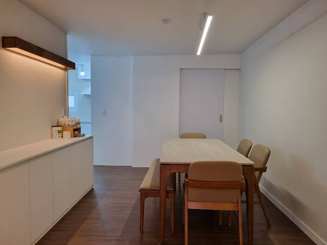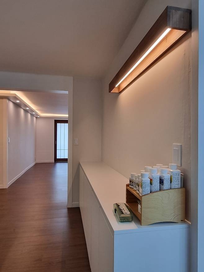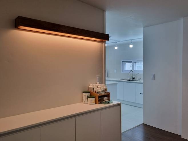 '여유가'의 첫 인상이 되는 현관은 깔끔하고 따스한 느낌이기를 바랐습니다. 현관문은 내부 인테리어와 맞춰 진한 월넛 시트지 작업을 하였으며 신발장은 기존 신발장 철거 후 손잡이 없는 심플한 형태로 만들었어요. 신발장 하단에는 간접 조명을 설치하여 따스하고 밝은 느낌을 주었구요.