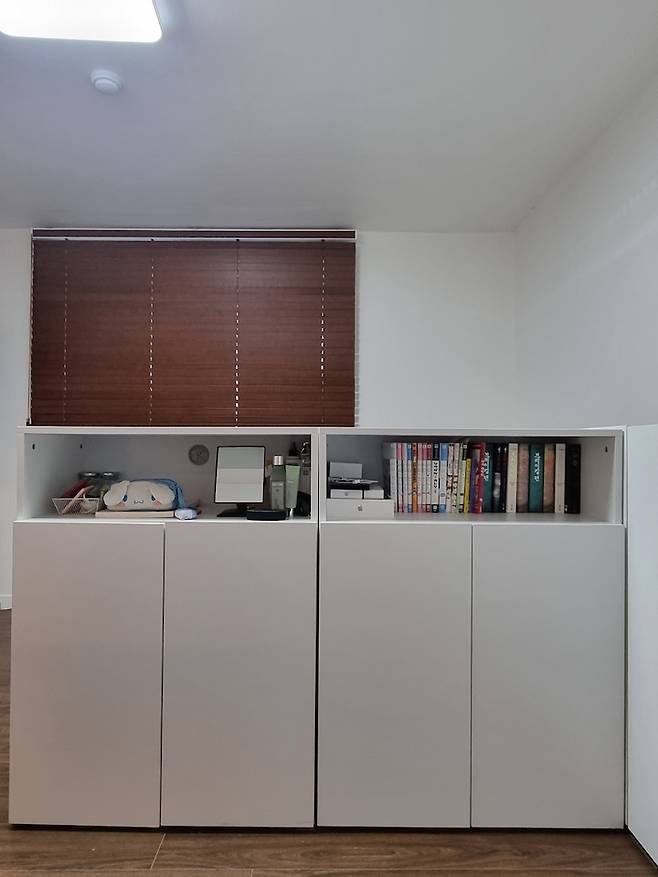 생각보다 길이가 길어서 미싱 재료나 원단들을 넣어 놓고 넉넉히 잘 쓰고 있어요. 수납장 끝 쪽은 매일 사용하는 화장품을 바구니에 넣고 사용하려 오픈장으로 제작했습니다.