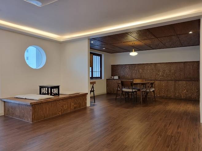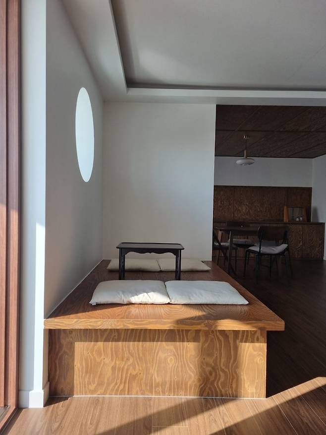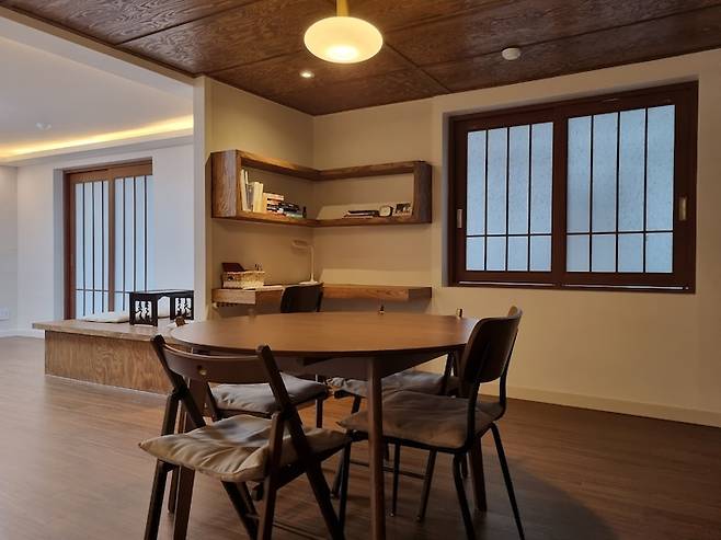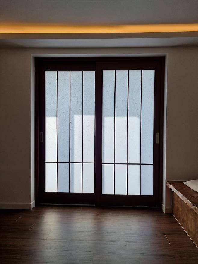 거실 새시를 철거한 곳에는 평상과 어울리는 미닫이 맞춤문을 제작하였습니다.