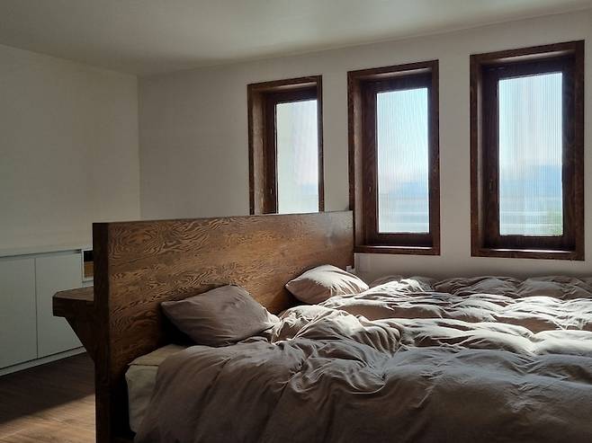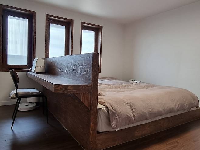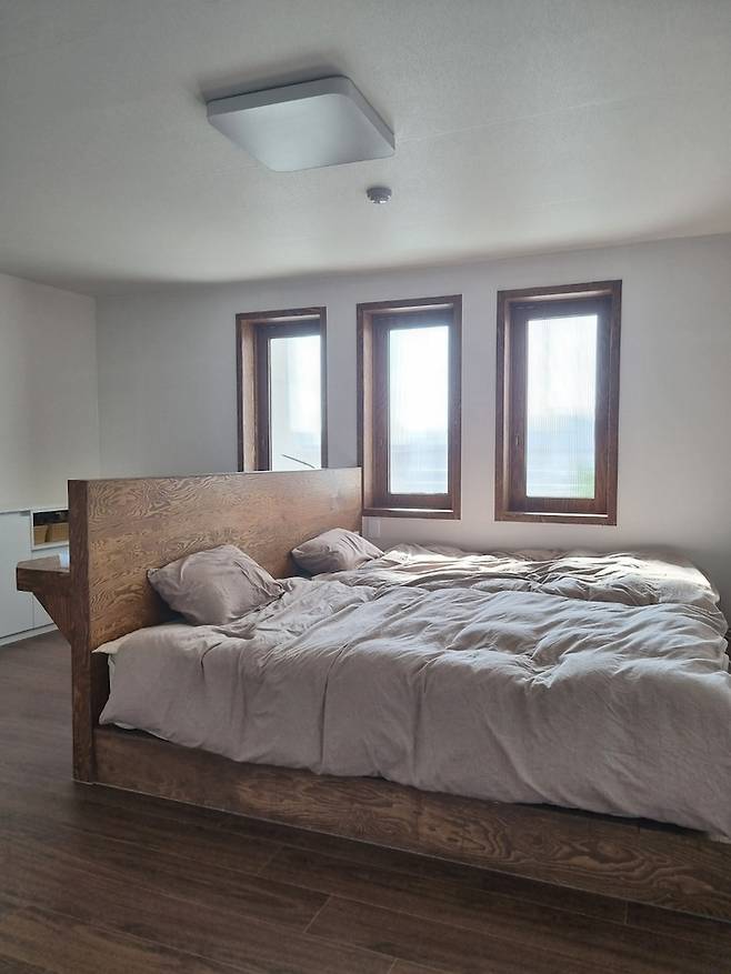침대 프레임도 현장에서 제작한 제품으로 역시나 낙엽송이며 수퍼싱글 매트리스 2개 들어갈 사이즈로 제작하였습니다. (프레임 제작 시 매트리스 사이즈에만 맞추면 안쪽에 있는 사람이 바깥쪽에 있는 사람을 넘어와야하는^^ 일이 생기게 되니 매트리스 사이즈보다 조금 더 넉넉하게 제작하시는 방법이 더 좋으실 것 같아요)
