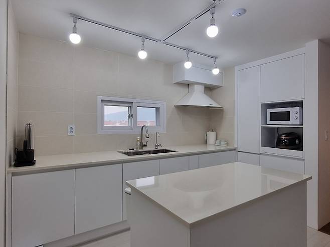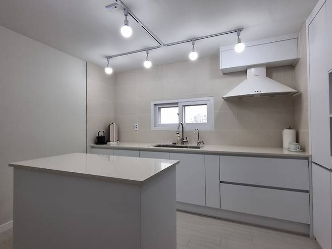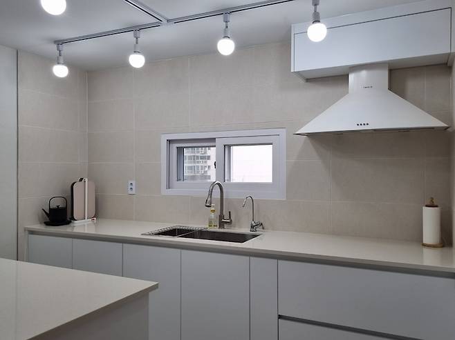 살림이 많지 않아서 싱크대는 기존 ㄱ자를 ㅡ 자형으로 변경하고 대신 수전 위치를 창가 쪽으로 옮겨 개수대의 위치만 바꾸었습니다.