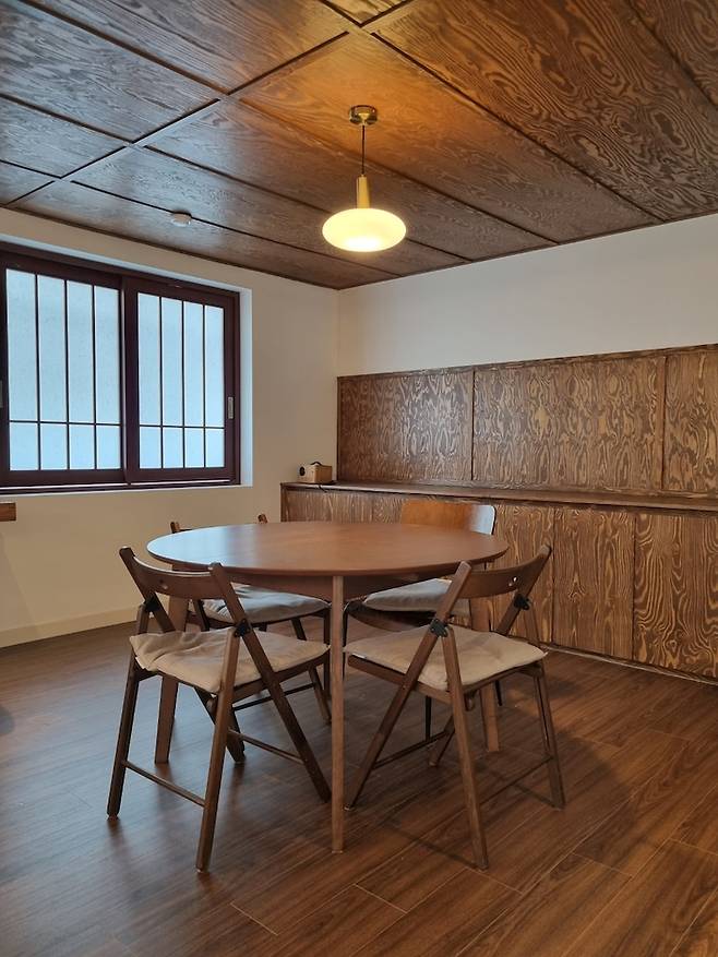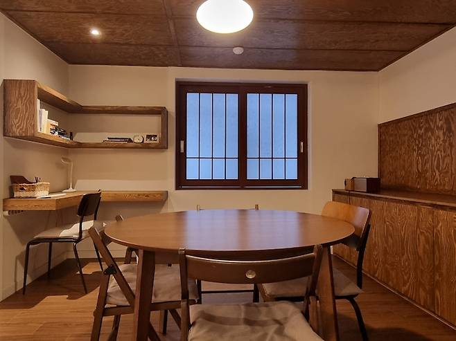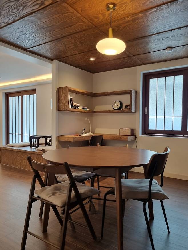 낙엽송을 기본으로 목공 작업을 하다 보니 전등을 켰을 때와 껐을 때의 분위기도 다르고 색감도 달라지는 게 느껴져서 찍어봤으며 남향집이라 실제로 낮에는 불은 거의 켜고 있지는 않아요.