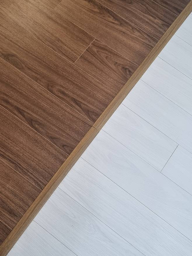 그런데 설치 당일에 도착한 강마루를 보니 제품 라인이 달라 마루 폭이 다르고 단차도 3mm정도 생기게 되었습니다. 이미 제품이 도착한 상태이고 공사 시간도 부족하였기에 그냥 작업하고 마무리 했는데 단차가 미세하게 있지만 크게 불편을 느낄 정도는 아니에요.
