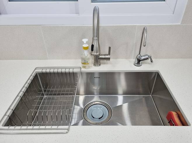 수전은 싱크대 사장님 추천으로 설치했는데 생각보다 큰 사이즈에 깜짝 놀랐던 기억이 있네요. 그러나 막상 사용해 보니 사각 싱크볼과 나름 잘 어울리고 물도 많이 안튀어 만족하며 사용중입니다.