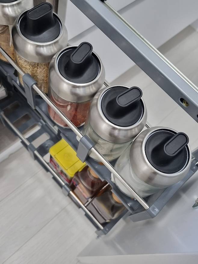 싱크대에 슬라이딩으로 만든 양념통 서랍이에요. 마트에서 우연하게 본 양념통이 맘에 들어 2세트나 사왔는데 뚜껑에 스푼이 있어서 사용하기도 엄청 편해서 잘 쓰고 있어요.