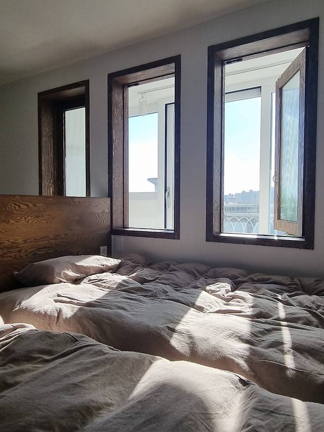 안방의 기존 새시 창문 철거 후 사진입니다. 창이 너무 커서 침대 프레임에 맞게 높이를 조절했으며 원목 창틀을 만들어 놓았습니다. 원목창이 안방의 포인트가 되어 아파트 느낌보다는 주택 같은 느낌이 들어요.