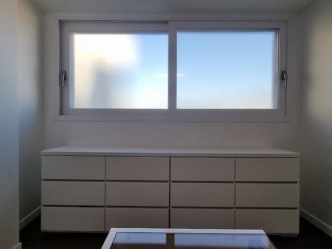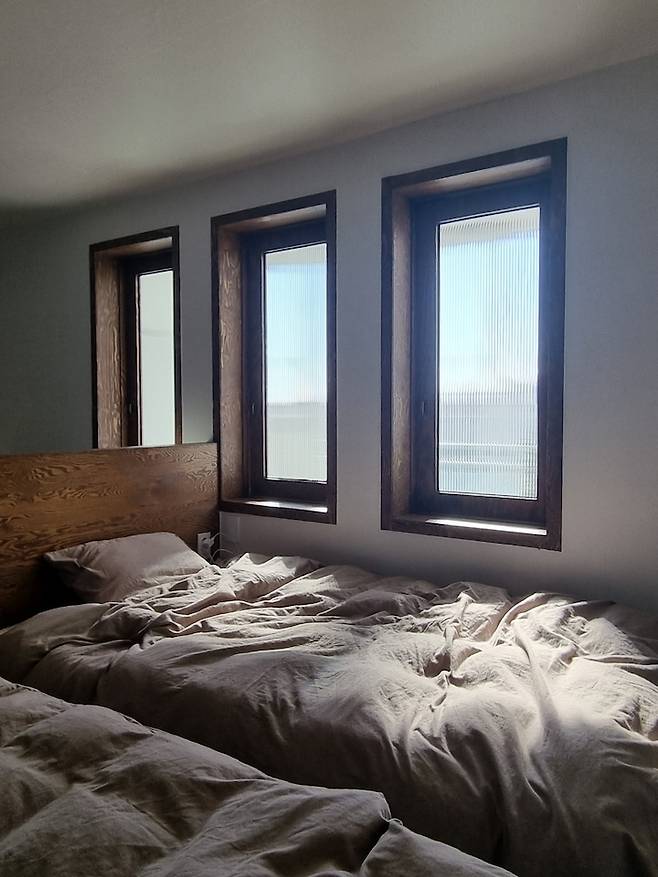 창문은 세로로 길게 만들었으며 환기를 위해 모두 180도로 열리도록 제작했습니다. 문을 열면 바로 베란다라 사생활 보호 차원에서 모루 유리를 끼워 두었고 아침에는 햇살이 눈부시지 않을 만큼 딱 좋은 빛이 들어 온답니다.