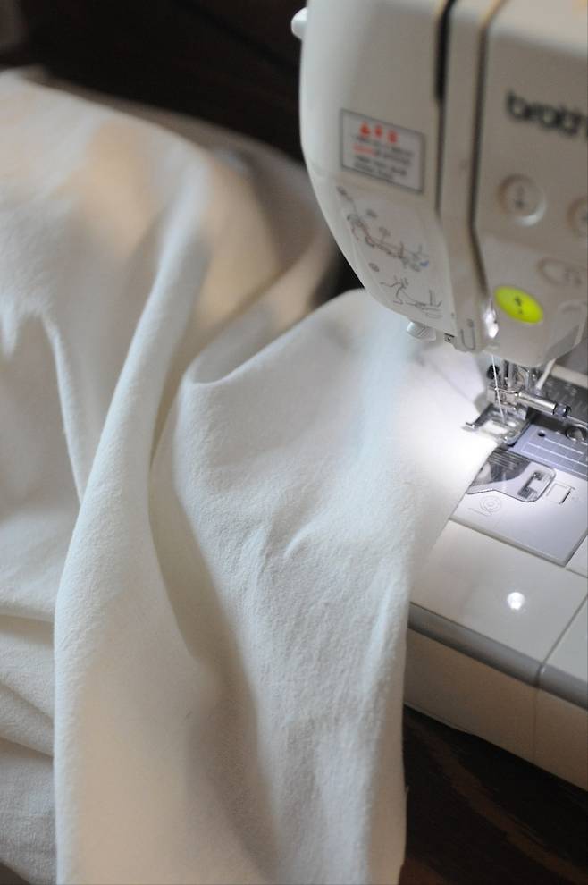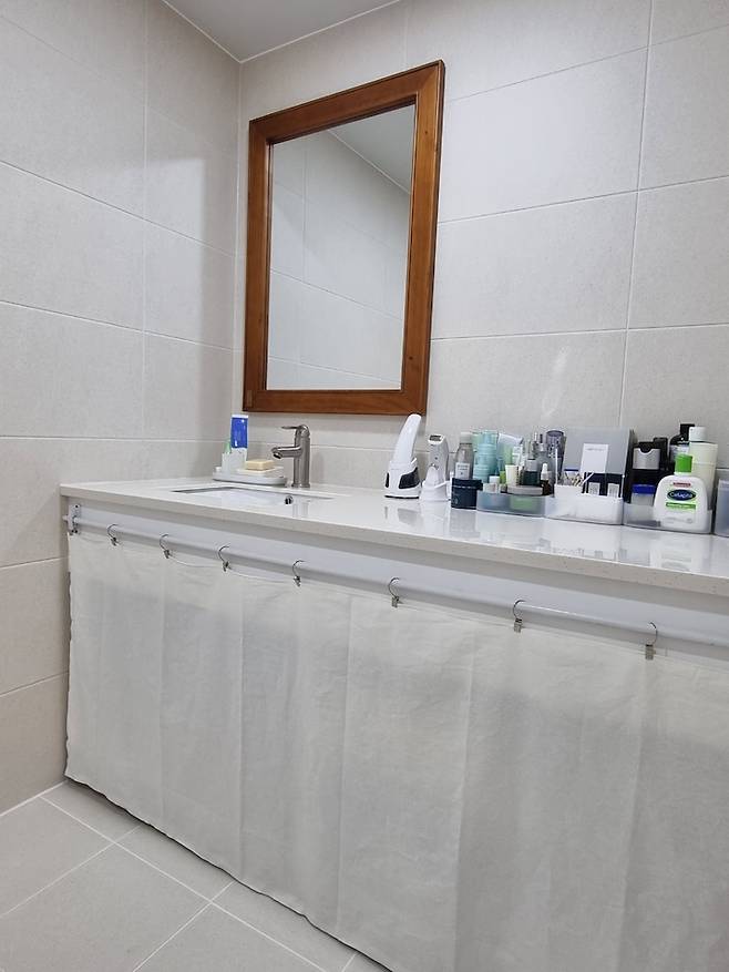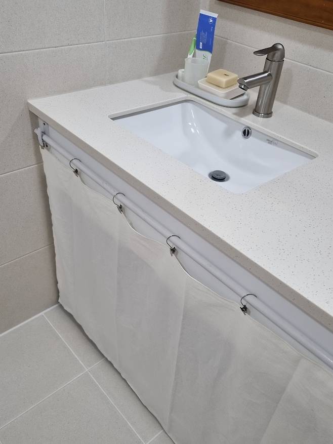 욕실에 수납장을 설치하지 않아 세면대 아래 쪽에 선반을 두고 사용하고 있습니다. 물품 정리를 깔끔하게 못하는 편이라 욕실 물품이 너무 지저분해 보이더라구요. 그래서 린넨 원단 구입한 후, 드륵~드륵~~ 직선박기만 해서 이렇게 슬쩍 가려 놓았습니다.