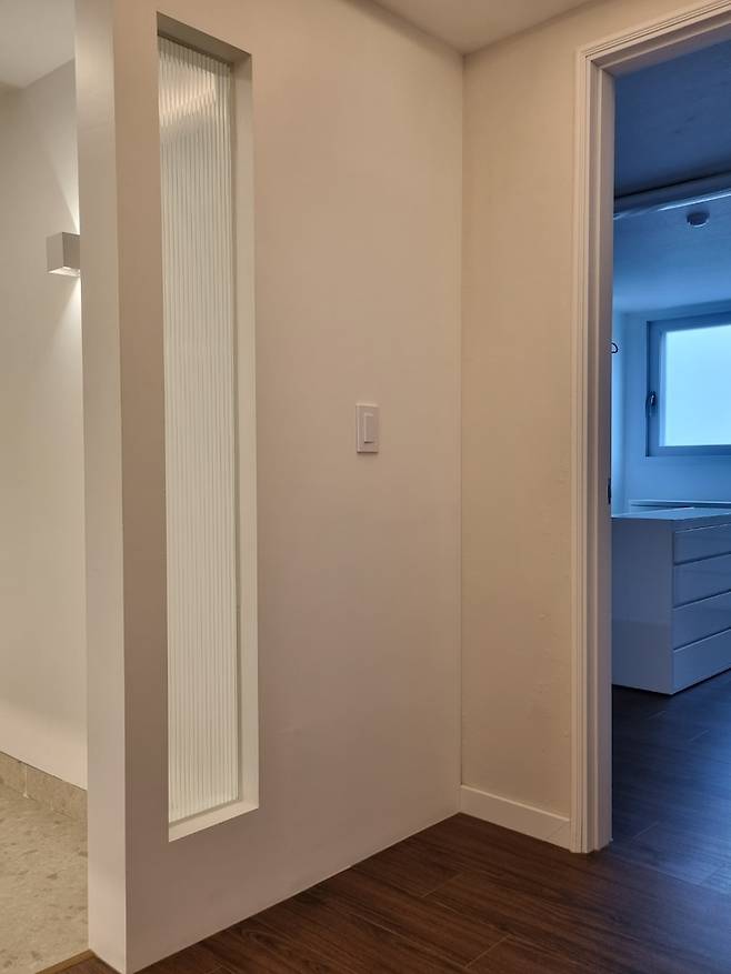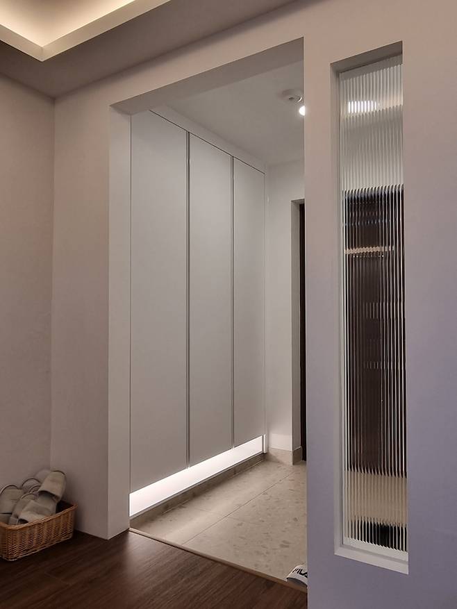 중문이 없는 현관이라 들어오자마자 왼쪽으로 화장실 문이 바로 보였습니다. 그래서 중문 대신 한쪽에 가벽을 설치한 후 모루 유리를 끼워 넣었습니다. (모루유리는 답답함은 없으면서도 노출이 좀 부담스러운 곳에 좋아요)