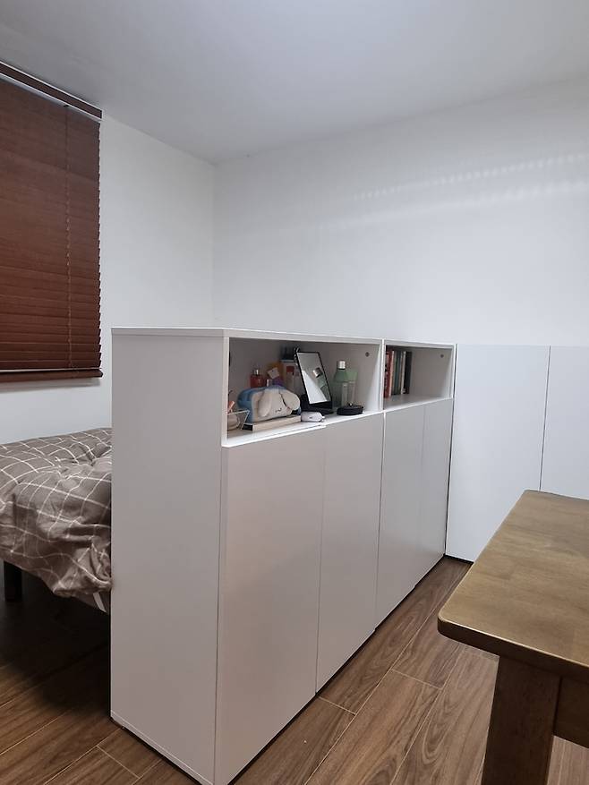 화이트 수납장을 ㄱ 자로 배치하여 공간을 분리해 주었으며 방문을 열면 침대 공간이 보이지 않아 아들 녀석이 엄청 좋아합니다.