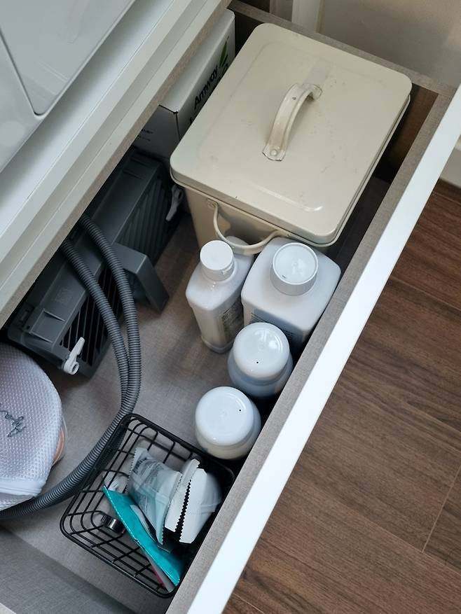 아래 쪽에는 서랍을 두어 한쪽에는 세탁 용품을~ 다른 쪽에는 빨래를~ 서랍에 쏙쏙 넣어두니 수납 효과도 있고 밖으로 나와있는 용품들이 없어져서 200% 만족 중입니다.
