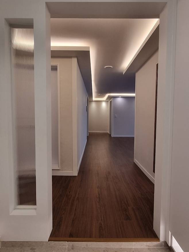 현관 맞은 편에서 본 복도이며 왼쪽으로는 거실, 오른쪽으로는 다이닝룸과 주방이 있습니다. 벽면은 실크 도배와 페인트(가벽만 페인트 공정으로 마무리)로 마감했어요.
