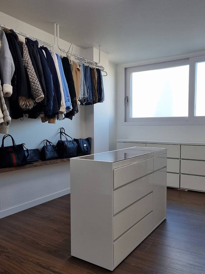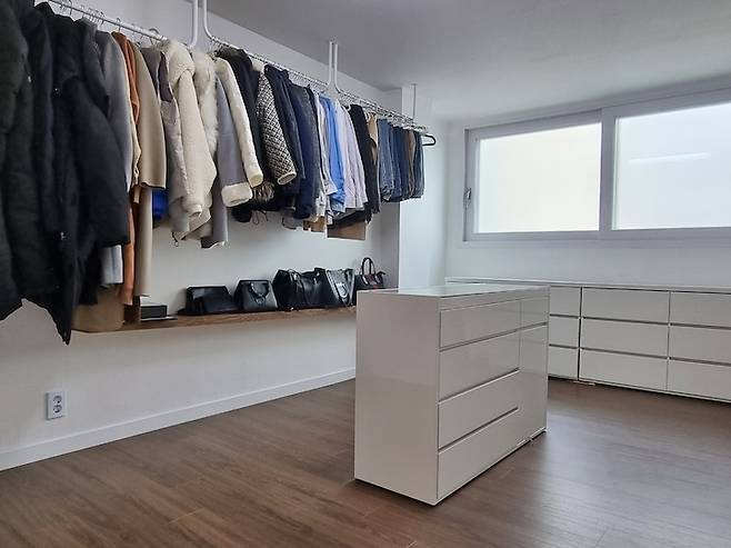 그런데도 과감하게 따로 옷장을 만들지 않고 행거만 설치 후 옷을 걸어 사용하고 있네요. 나머지 걸어 놓을 수 없는 의류는 서랍장에 수납 중입니다.