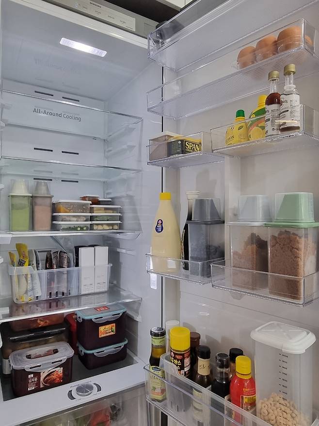 정리 잘하시는 분이 보신다고 생각하니 쑥스럽기는 한데 그나마 냉장고 정리 용기를 구입하여 이 정도가 정리된 상태랍니다. ㅎㅎ