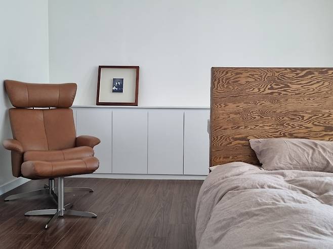 구축 아파트다 보니 안방 공간이 넓게 빠져서 침대 프레임을 제작하고 남는 공간에는 붙박이로 수납장을 넣었습니다. 사장님은 옷장을 넣자고 하셨는데 옷장에 넣을 만큼 옷이 많은 것도 아니고 가지고 있는 옷도 정리하였기에 낮은 높이의 수납장을 넣었습니다.