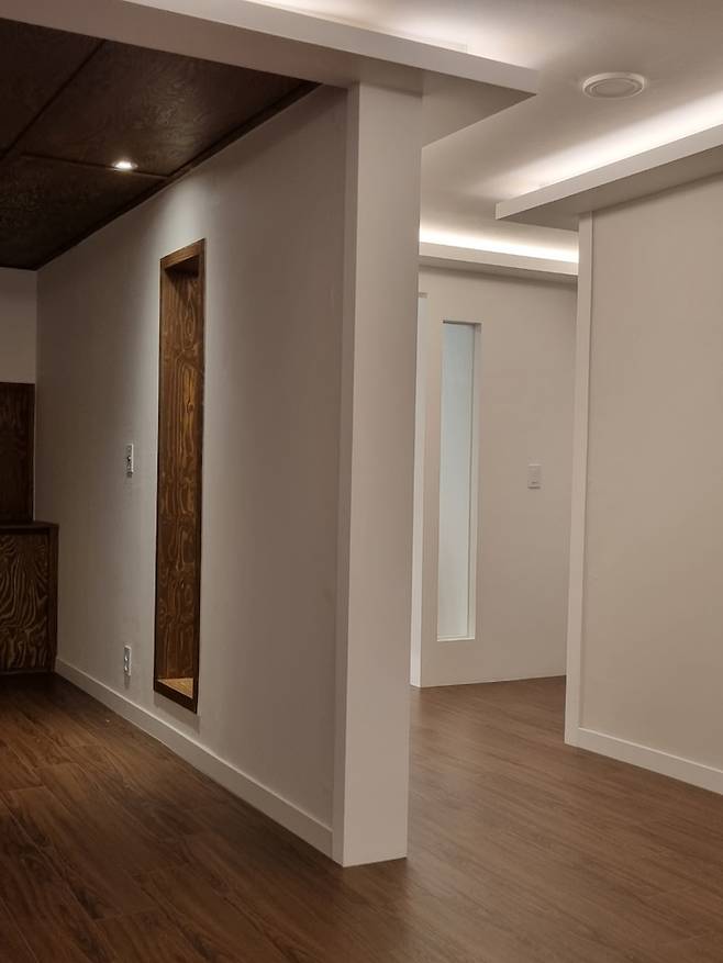 친정 엄마가 오셔서 거실 뒷 쪽이 베란다라 추울 것 같다고 하셨는데 사장님께서 가벽을 치면서 가벽 안쪽에 보온재를 넣어 단열을 보강해 주셨기에 단열도 잘 되고 있습니다.