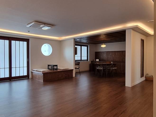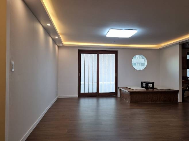 거실 새시를 철거한 곳에는 평상과 어울리는 미닫이 맞춤문을 제작하였습니다.