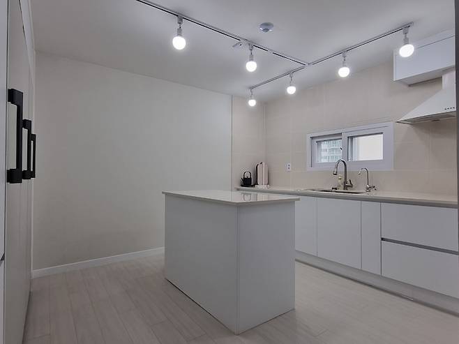 살림이 많지 않아서 싱크대는 기존 ㄱ자를 ㅡ 자형으로 변경하고 대신 수전 위치를 창가 쪽으로 옮겨 개수대의 위치만 바꾸었습니다.