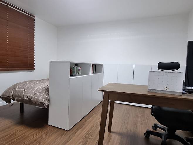 현재는 입학식 전이라 저희 둘째 아이가 쓰고 있는 방입니다. 침대는 매트리스 일체형 침대입니다. 매트리스 일체형 침대를 사용하는 큰아이가 심플하고 깔끔하다고 둘째 아이에게 추천해 주었습니다.