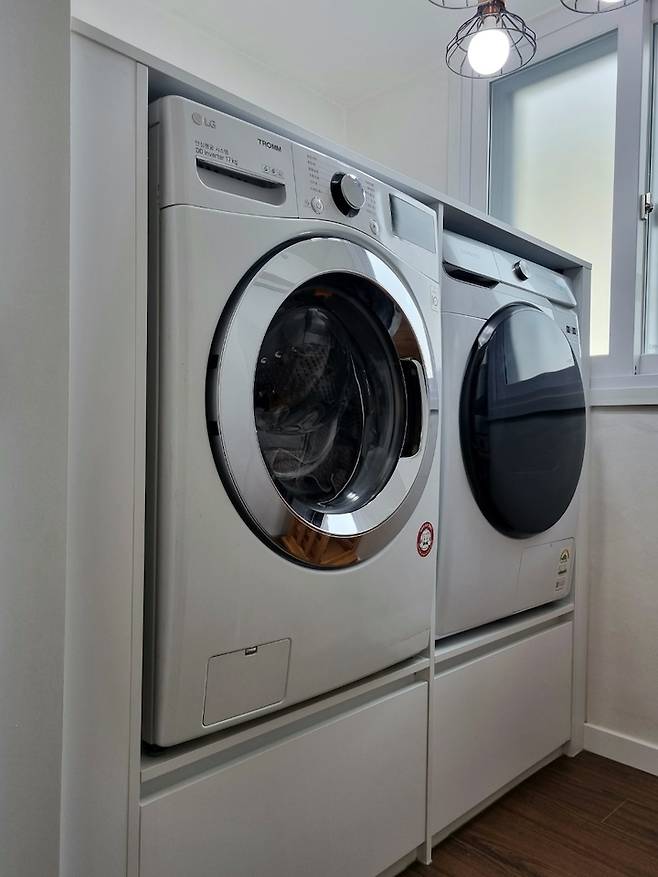 허리 굽히는 일이 좀 부담이 되어 세탁실에서 허리가 불편하지 않도록 하는 게 중요한 일이었어요. 그래서 세탁실 리모델링 시 세탁기와 건조기를 수납장을 짜서 올렸습니다. 허리를 굽히지 않고 세탁물 이동을 할 수 있어서 편하게 사용 중이랍니다.