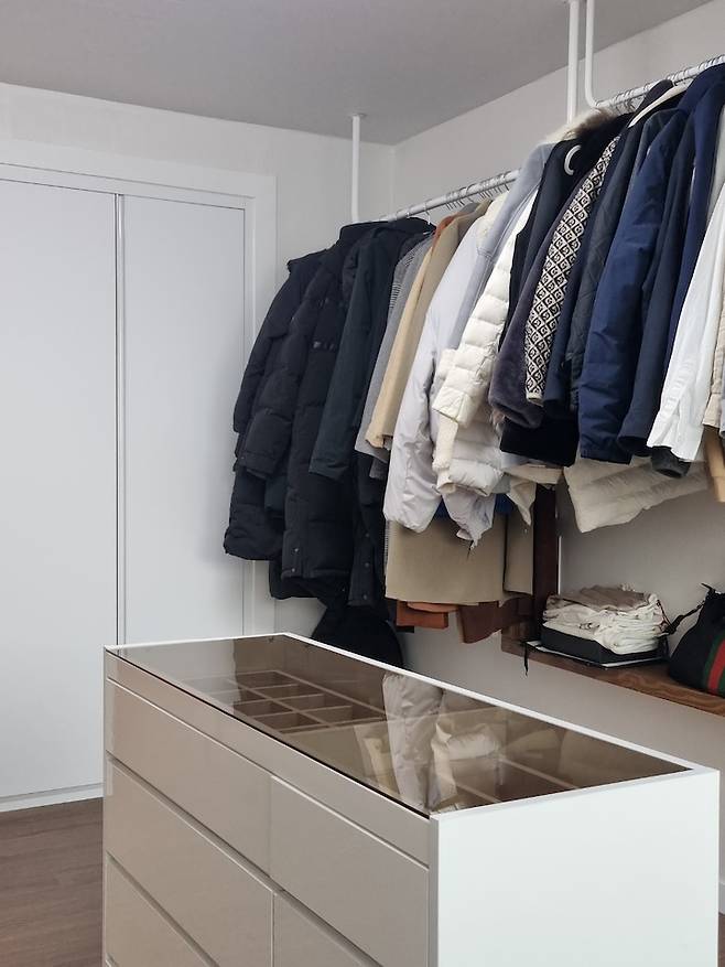 그런데도 과감하게 따로 옷장을 만들지 않고 행거만 설치 후 옷을 걸어 사용하고 있네요. 나머지 걸어 놓을 수 없는 의류는 서랍장에 수납 중입니다.