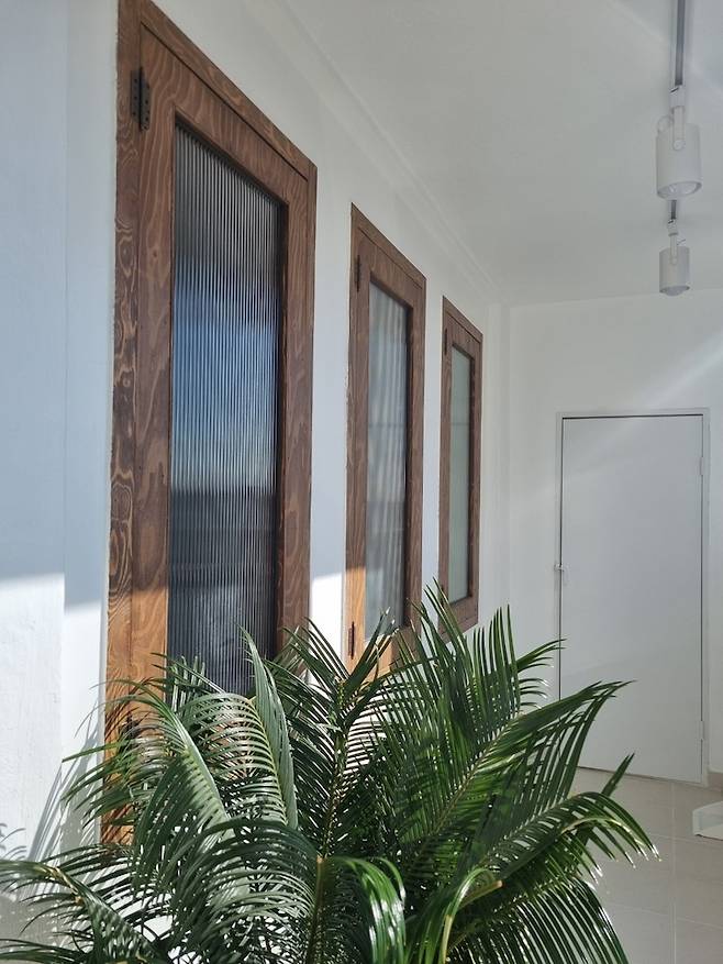창문은 세로로 길게 만들었으며 환기를 위해 모두 180도로 열리도록 제작했습니다. 문을 열면 바로 베란다라 사생활 보호 차원에서 모루 유리를 끼워 두었고 아침에는 햇살이 눈부시지 않을 만큼 딱 좋은 빛이 들어 온답니다.