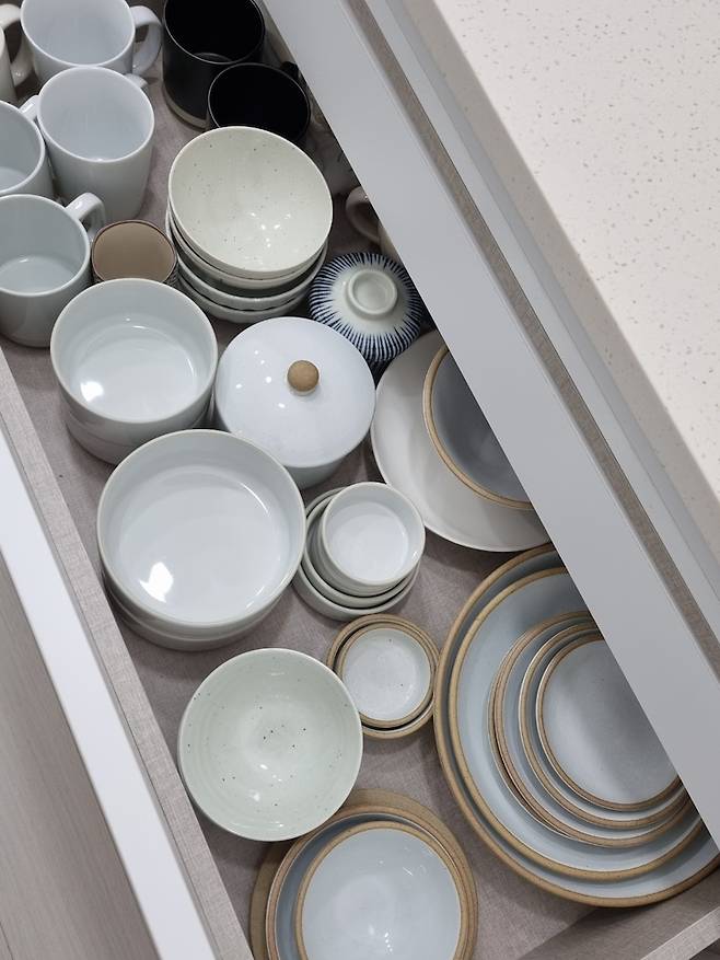싱크대 한쪽은 서랍형으로 만들어 자주 쓰는 그릇들만 넣어서 사용하고 있으며 그릇도 색상이 있거나 무늬가 있는 것 보다는 심플한 스타일을 좋아해서 화이트 식기류를 쓰고 있습니다.