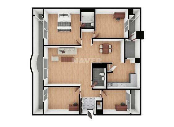 거실에서 이어진 다이닝룸입니다. 다이닝룸은 거실과 연장된 느낌으로 월넛 강마루를 깔아 주었고 식탁과 수납장으로만 채워 보았습니다.