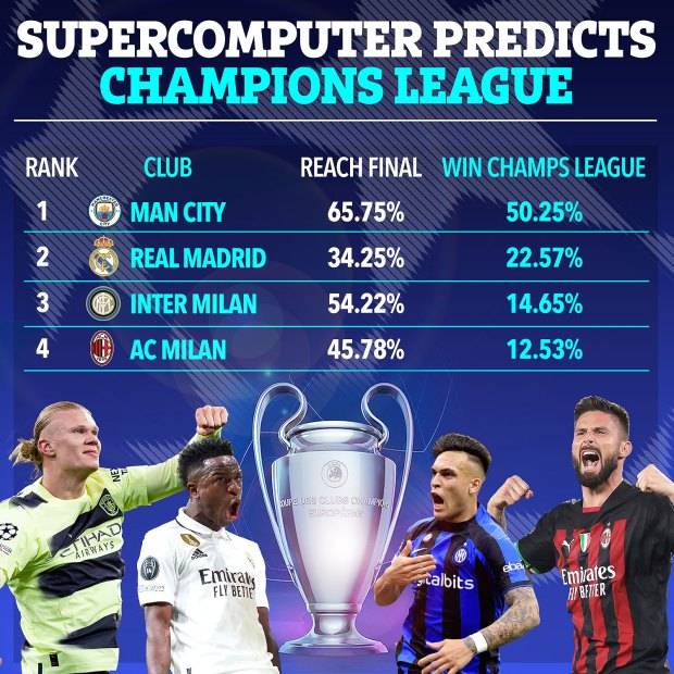 영국 언론 더 선은 21일(한국시간) 2022/23시즌 UEFA(유럽축구연맹) 챔피언스리그 준결승 진출팀이 확정된 뒤 슈퍼컴퓨터가 예측한 준결승 네 팀의 우승 확률을 뽑아 소개했다.