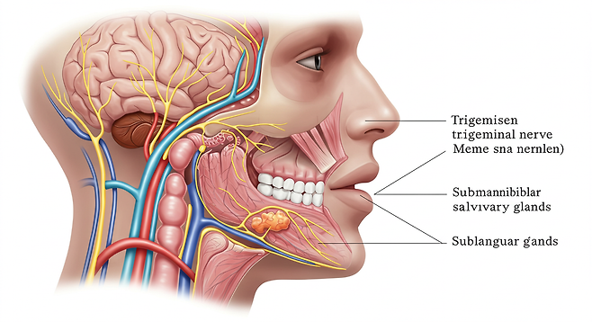 삼차신경은 얼굴과 머리의 감각을 뇌에 전달하는 중요한 신경이다. 이 신경에 문제가 생기면 얼굴에 갑작스럽고 날카로운 통증이 찾아온다. 반면 침샘암 중에서도 특히 샘낭암 같은 유형은 신경계를 침범하는 특성이 있어 비슷한 통증을 유발한다.