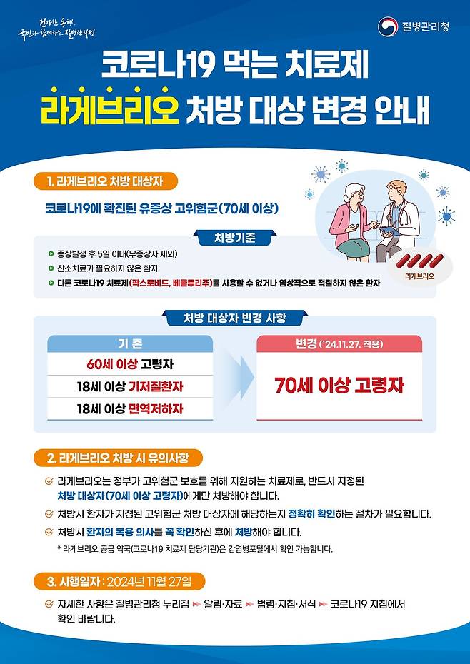 정부에서 공급하고 있는 코로나19 먹는 치료제 ‘라게브리오’의 처방 기준 연령이 70세로 상향 조정된다. 질병관리청은 내일(27일)부터 라게브리오 처방 기준 연령을 기존 60세에서 70세로 상향 조정한다고 밝혔다.