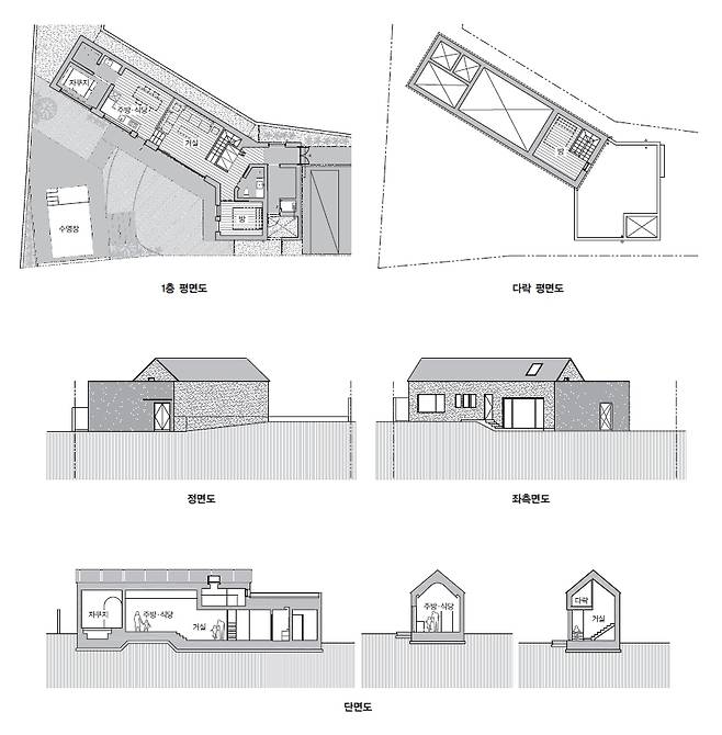 4m 현황도로와 인근 주택이 근접해 있는 대지 상황 및 농어촌 민박으로 사용될 장소의 특성을 고려해야 했다. 대지의 형상은 도로에 면한 부분은 좁고 낮으며, 도로에서 멀어질수록 넓어지고 높아지는 이형적 형상을 가지고 있었다. 대지가 가지고 있는 이러한 형상 및 높낮이를 어떻게 이용할 것인지에 대한 고민으로 프로젝트를 시작했다.