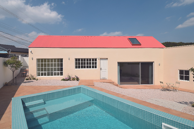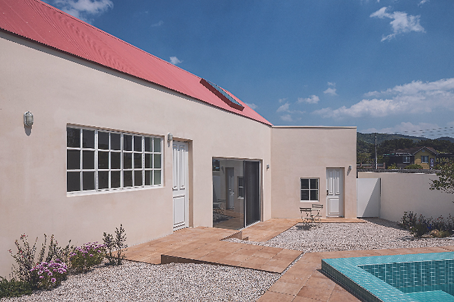 건축주는 야외 수영장 및 실내 자쿠지를 갖추고, 최대 6인이 머무를 수 있는 장소를 원했다. 이에 적정 규모의 마당 및 수영장 확보를 위해 건물 배치를 북측으로 세장하게 해 대지를 최대한 활용했으며, 기존 대지의 레벨 차이를 고려해 내부 및 외부를 두 가지 레벨로 구성함으로써 다양한 공간감을 느낄 수 있도록 했다.