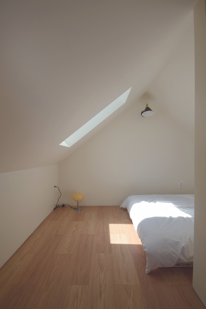 도로에 평행하게 주차장이 위치하고, 건축주의 취향이 담긴 현관문을 통해 들어오면 관리를 위한 방이 좌측에 있으며, 복도를 지나면 욕실과 방 그리고 전자제품을 빌트인할 수 있는 계단 하부 수납장이 있다. 천창이 있는 다락으로 가는 계단이 있으며, 남향의 거실과 주방/식당 자쿠지가 나란히 외부 마당과 실외 수영장을 향해 배치돼 있다. 천장의 형태 변화와 대지의 레벨 차이로 인해 내부공간은 다양한 형태를 가지게 된다.