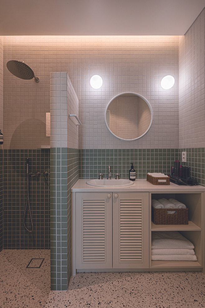 내부 마감은 친환경 마룻바닥과 지정색 페인트로 수행했는데, 일정한 품질 확보와 독특한 색상의 제작가구를 통해 특별한 머무름의 경험이 느껴지도록 했다.