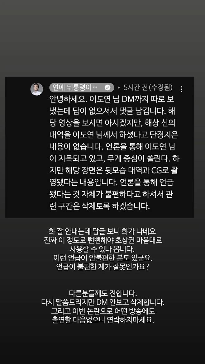 이진호는 이도연에게 "DM까지 따로 보냈는데 답이 없어 댓글을 남긴다. 해당 신 대역을 이도연이 했다고 단정 지은 내용은 없다. 언론을 통해 이도연이 지목됐고, 무게 중심이 쏠린다. 하지만 뒷모습 대역과 CG로 촬영됐다는 내용이다. 언급 자체가 불편하다고 해 관련 구간은 삭제하겠다"고 말했다.