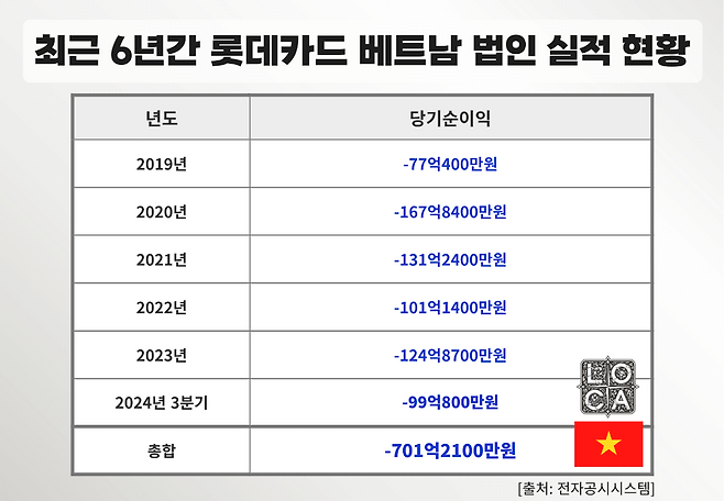 그러나 조 사장의 노력과 별개로 롯데파이낸스베트남의 경영 상황은 갈수록 악화되고 있다. ‘돈 먹는 하마’라는 평가까지 나올 정도다. 2019년 첫 해 77억400만원의 적자를 낸 롯데파이낸스베트남은 조 사장 취임 이후에도 매년 100억원이 넘는 순손실을 기록했다. 롯데파이낸스베트남의 최근 5년 간 순손실 규모는 ▲2020년 167억8400만원 ▲2021년 131억2400만원 ▲2022년 101억1400만원 ▲2023년 124억8700만원 ▲2024년 3분기 99억800만원 등이었다. 전체 손실액은 700억원에 달하는 것으로 추산됐다.